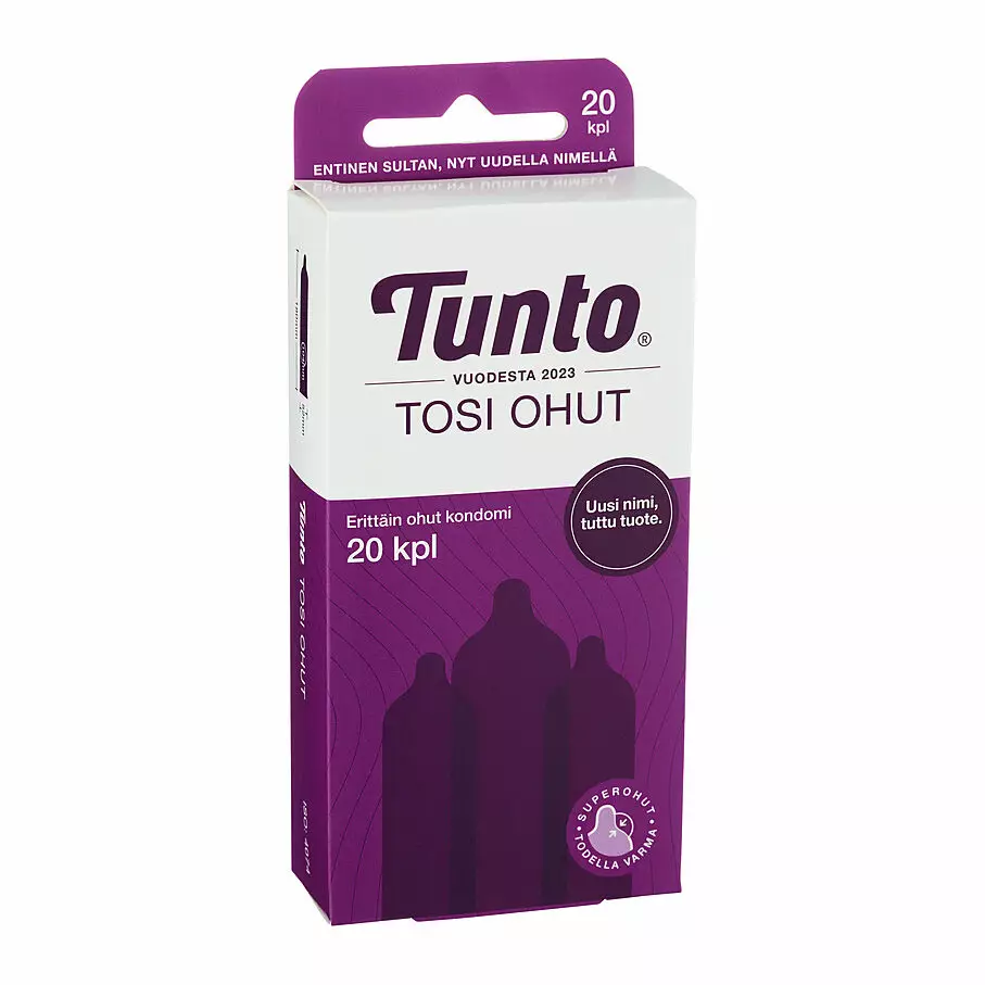 Sultan on nyt Tunto. Tunto Tosi Ohut Kondomi on superohut. Tuoksuton, väritön, sileä ja silikonipohjaisella liukasteella käsitelty lateksikondomi säiliöllä.